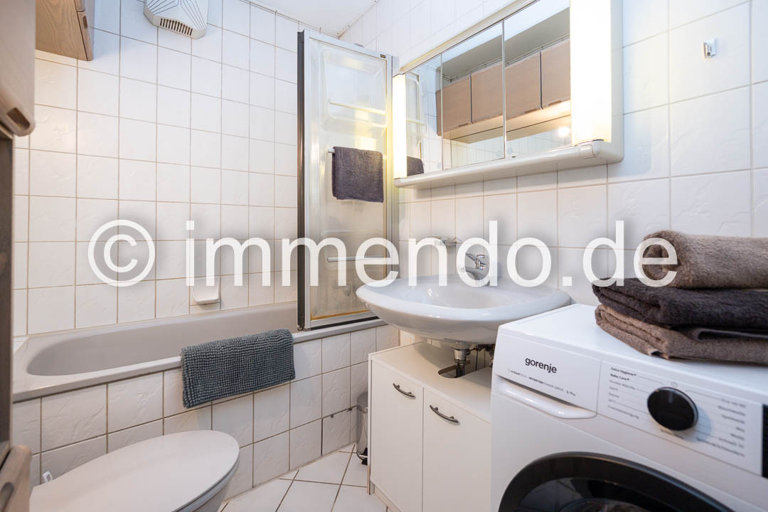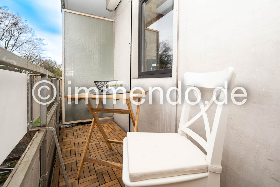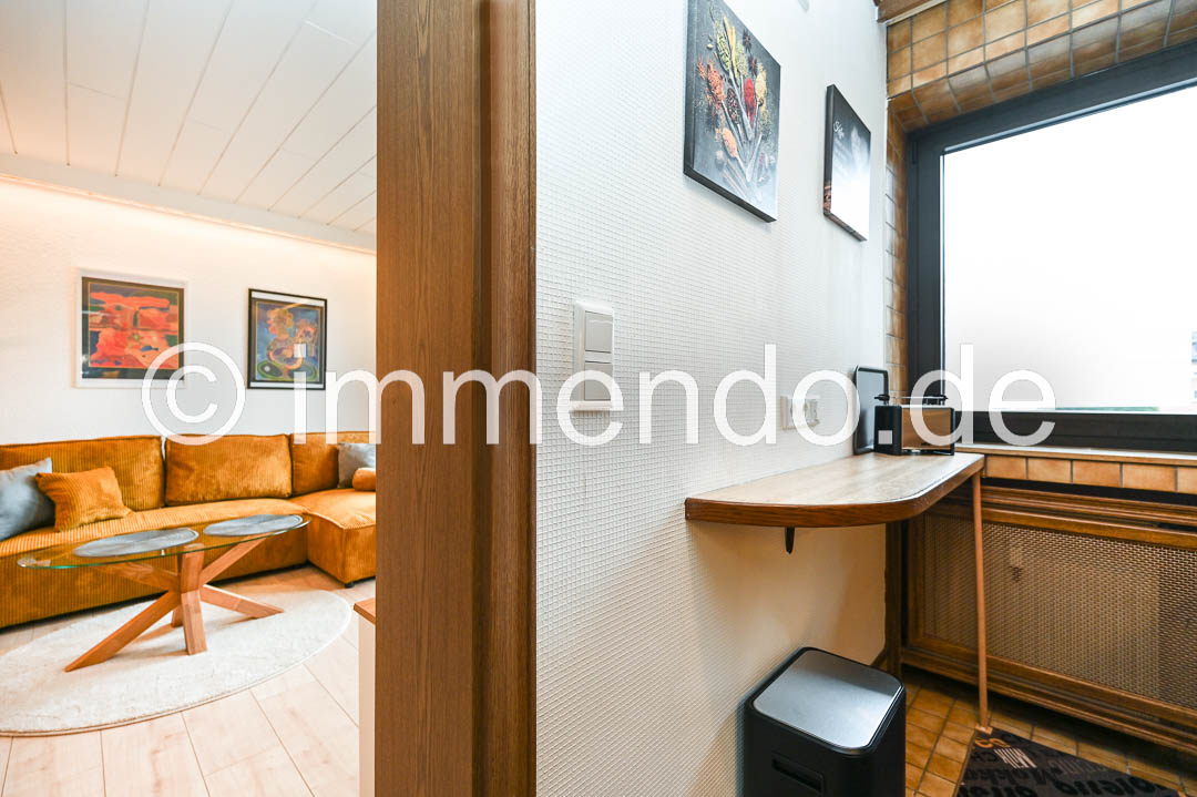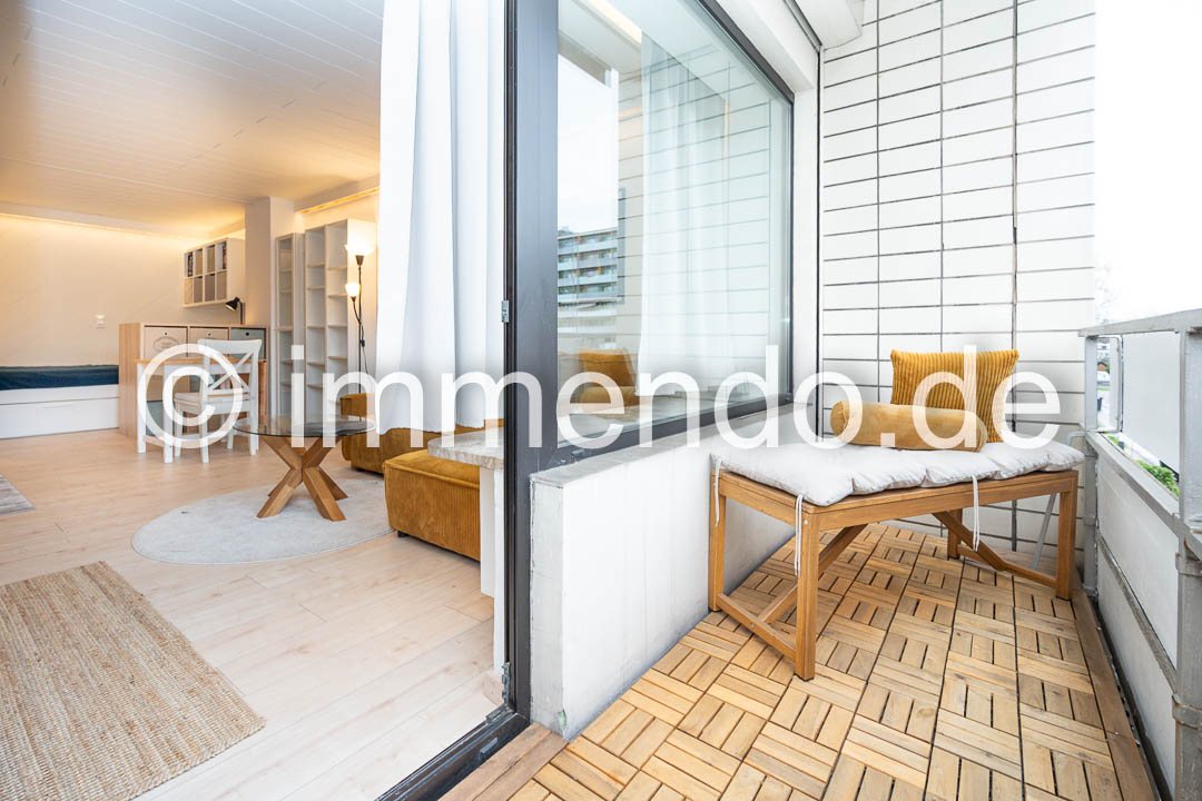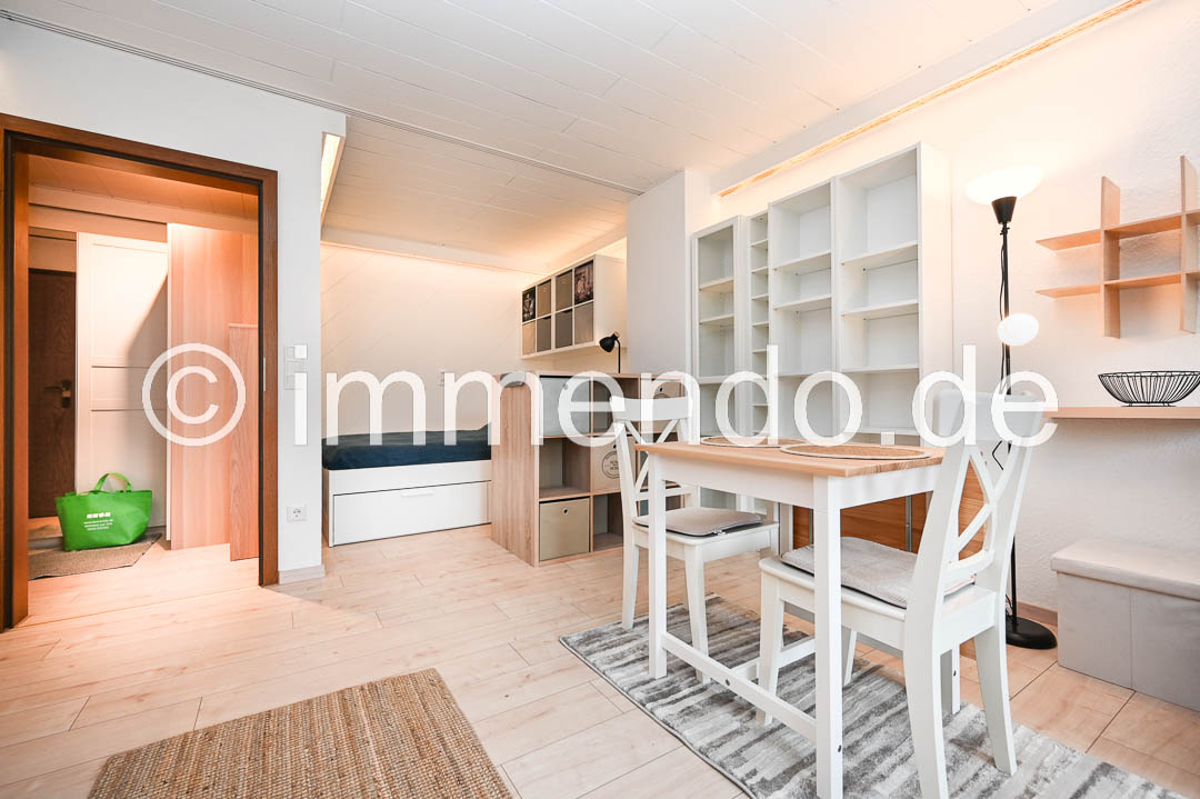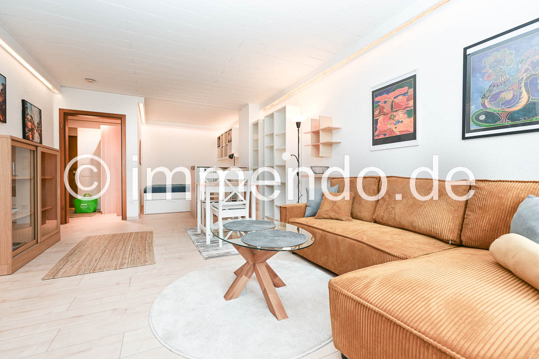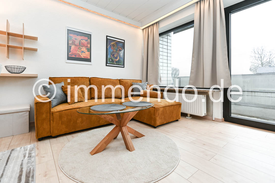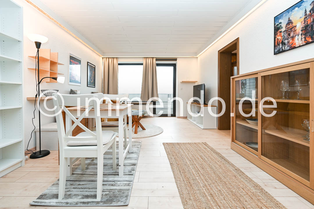 • Rheinhausen, hell möbliertes Apartment mit Balkon. Der lichtdurchflutete Wohnbereich ist das Herzstück der Wohnung und die offene Gestaltung sorgt für eine harmonische Atmosphäre. Ein modernes Sofa, ein abgeteilter Schlafbereich und ein einladender Esstisch laden zum Wohlfühlen ein. Die großen Fenster mit Zugang zum Balkon lassen viel Tageslicht hinein, bei Bedarf können sie durch elektrisch betriebene Rollläden verdunkelt werden. Die separate Küchenzeile ist mit einem Kühlschrank mit Gefrierfach und einer Mikrowelle mit Backfunktion fürs kleine Kochen gut ausgestattet. Im gepflegten Badezimmer bietet sich zusätzlich zum Stauraum durch einen großen Schrank, eine Wanne mit Duschtrennwand und eine eigene Waschmaschine. Im Flur steht ein großer Kleiderschrank und eine Kommode zur Verfügung.