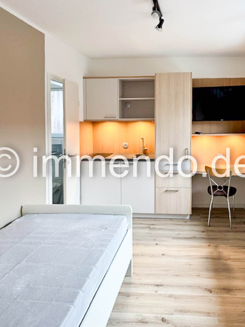 Walsum, möbliertes Apartment nahe der Rheinaue. Die Möblierung ist freundlich und hell. Der kompakte Wohnschlafraum ist mit einem bequemen 90×200 cm Bett, einem leicht zugänglichen Schreibtisch, einer praktischen Pantryküche und einem Kleiderschrank mit viel Stauraum bestens ausgestattet. Das moderne Bad ist mit einer Dusche eingerichtet.