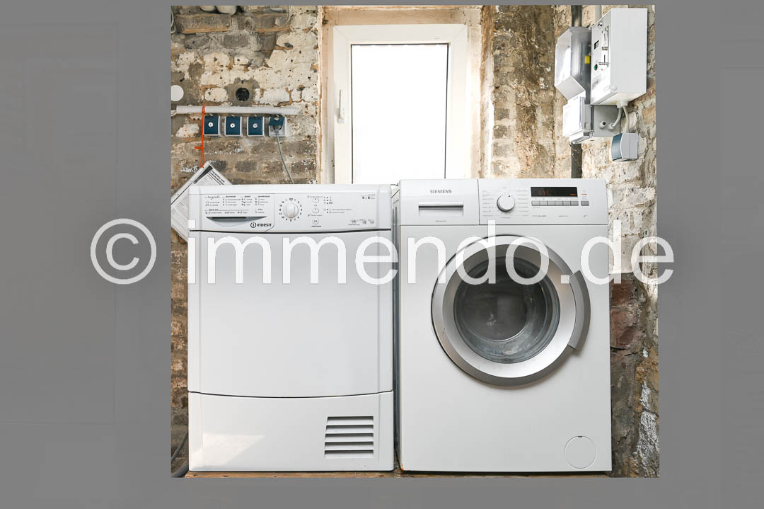 Eine Münzwaschmaschine und -trockner stehen im Waschkeller bereit.
