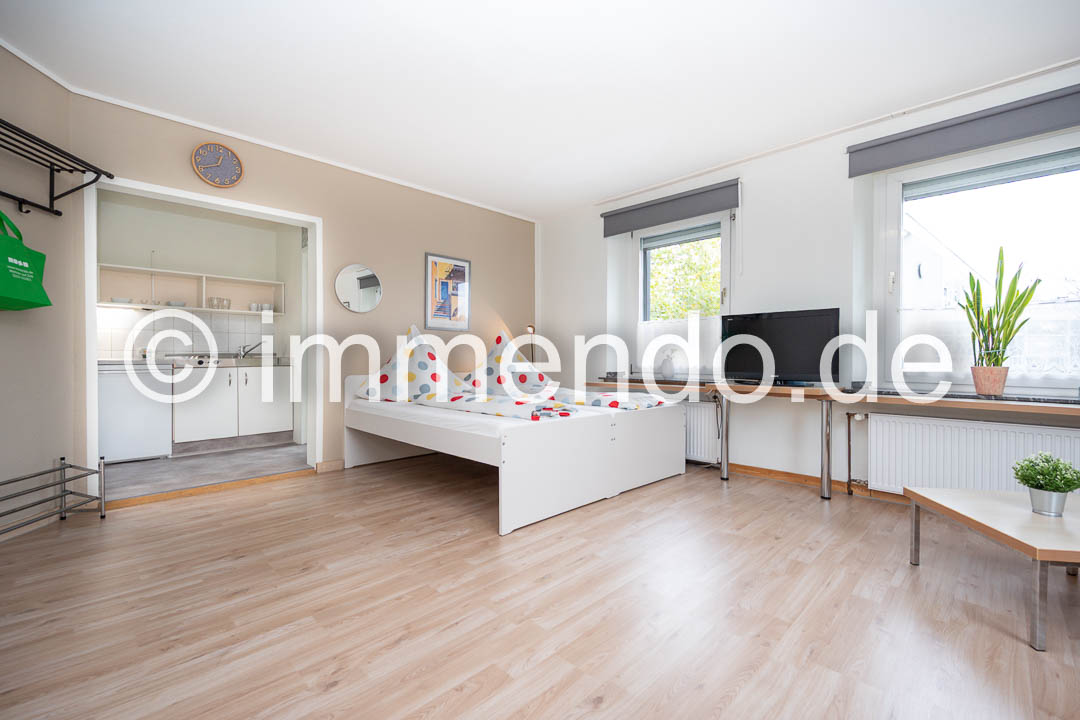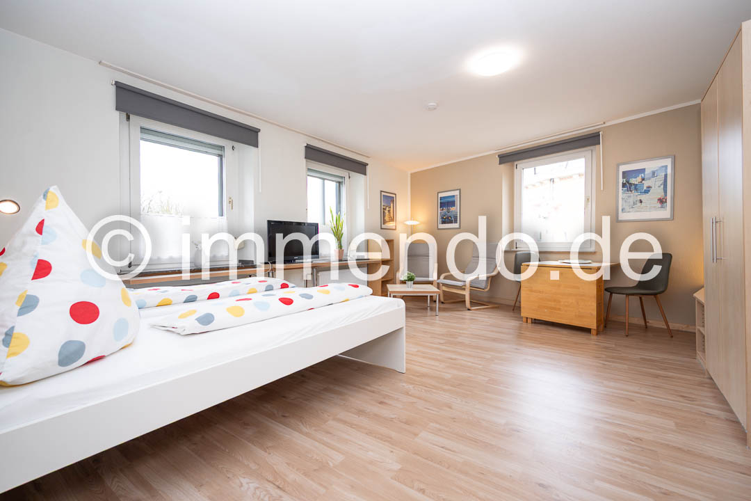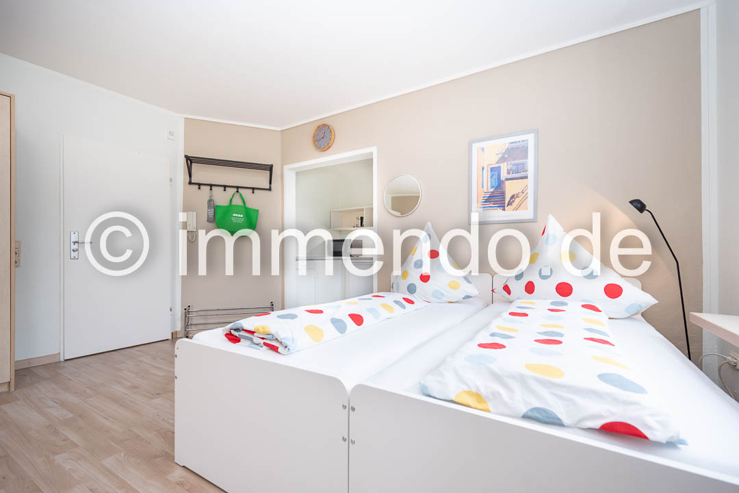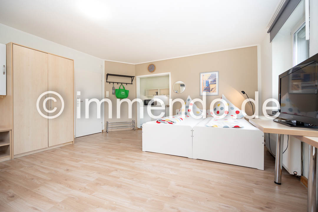 Saarn, schönes helles Apartment mit moderner Möblierung. Der große Wohn-Schlafraum lässt Gestaltungsfreiraum zu und ist mit einem Doppelbett, 2 Sesseln und einem Essplatz für 2 Personen ausgestattet. Wahlweise kann das Doppelbett auch in zwei Einzelbetten geteilt werden. Viel Stauraum bietet ein geräumiger Schrank. Die gut ausgestattete Küche grenzt an den Wohnraum und bietet eine Mikrowelle und zwei Herdplatten. Das Tageslichtbad verfügt über eine Glasdusche.