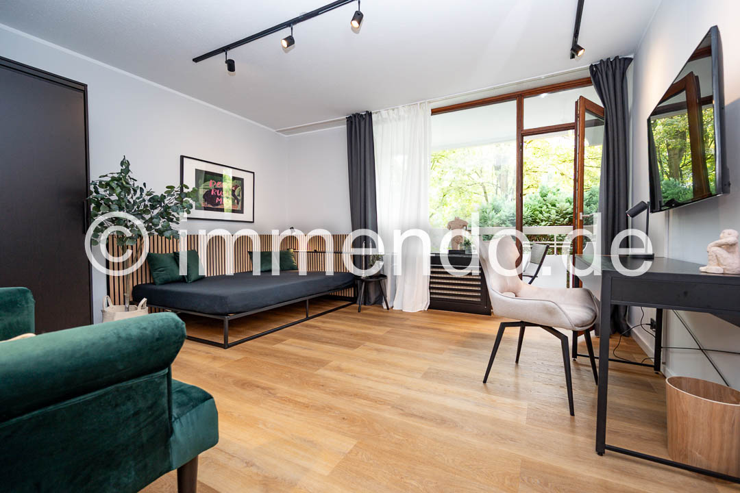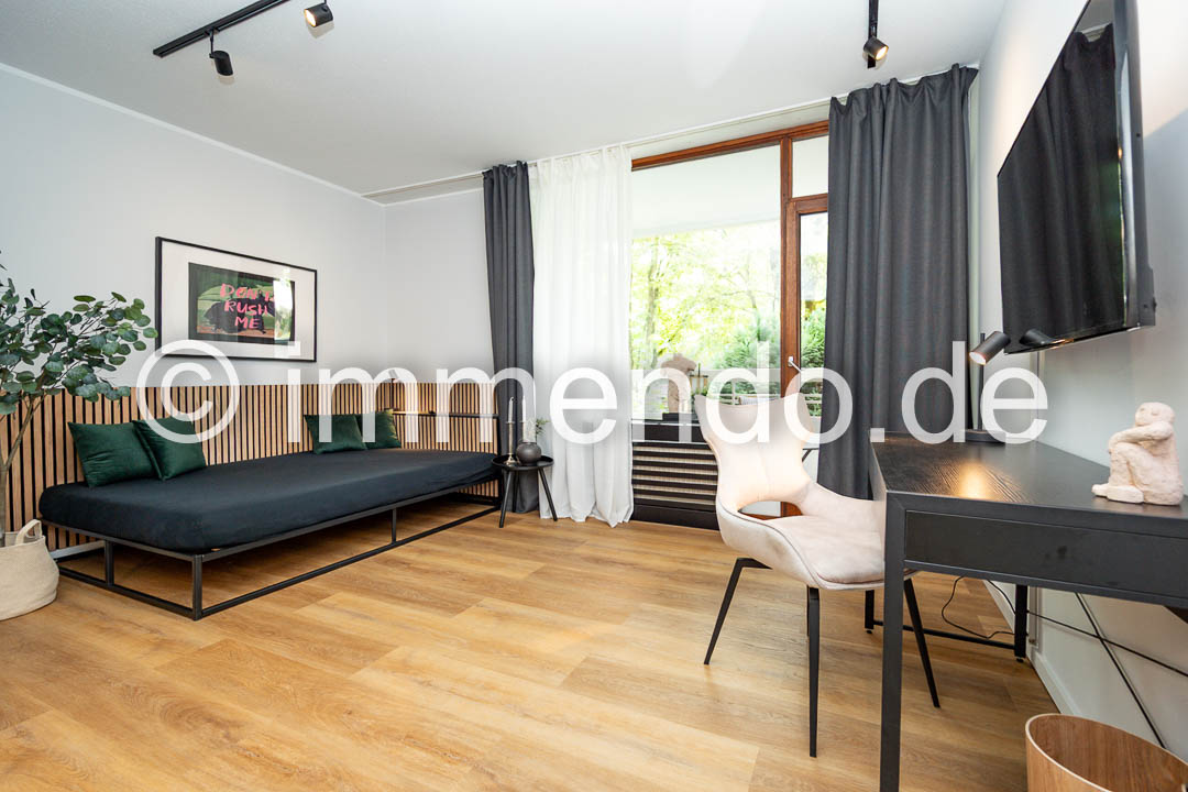 Broich, helles top modern möbliertes Apartment mit Balkon in ruhiger Waldnähe. Der frische moderne Look zeigt sich in allen Räumen. Der großzügig gestaltete Wohn-Schlafraum, mit Zugang zum sonnigen Balkon ist mit einem komfortablen Bett (140cm), einem großen Smart-TV, einem geräumigen Kleiderschrank perfekt aufeinander abgestimmt. Ein High-Speed-Internet-Anschluss und ein Schreibtisch ermöglichen Remote-Arbeit. Eine kleine, gut ausgestattete Küche bietet alles zum kleinen Kochen. Im Keller ist eine Waschmaschine, ein Trockner zur Mitbenutzung und ein Fahrradstellplatz vorhanden.