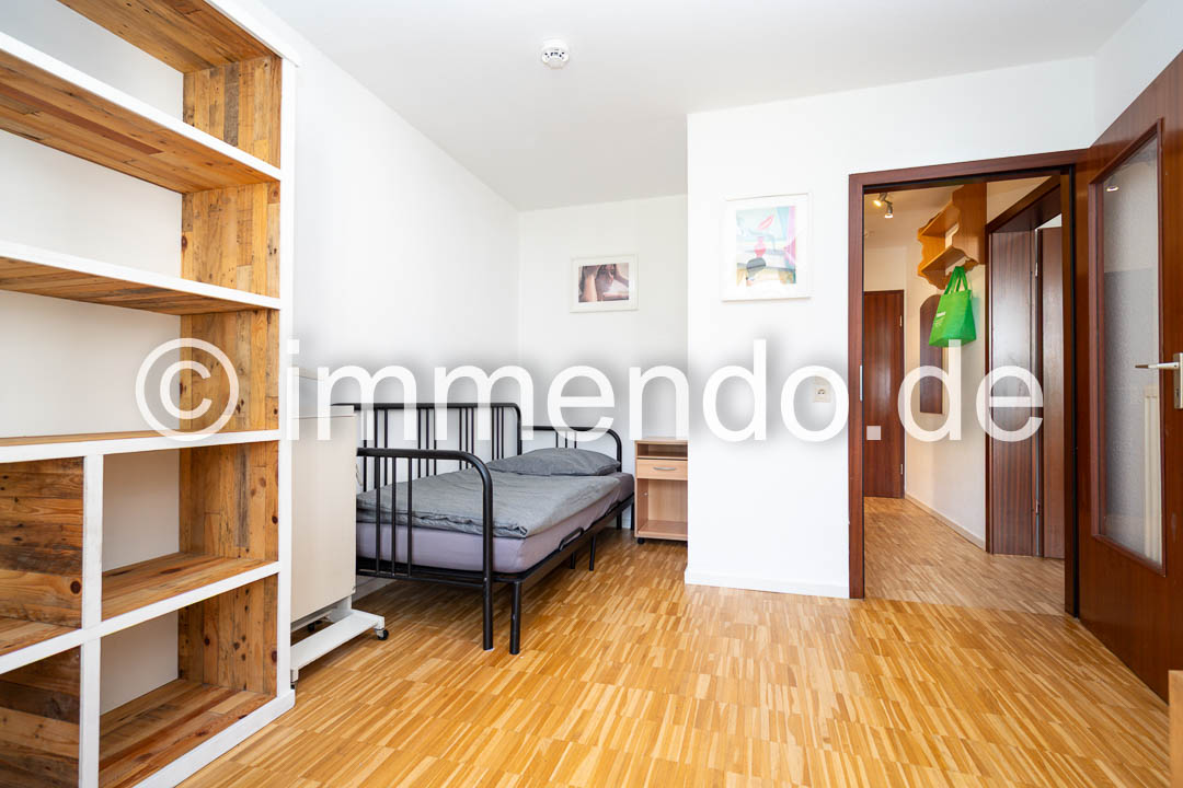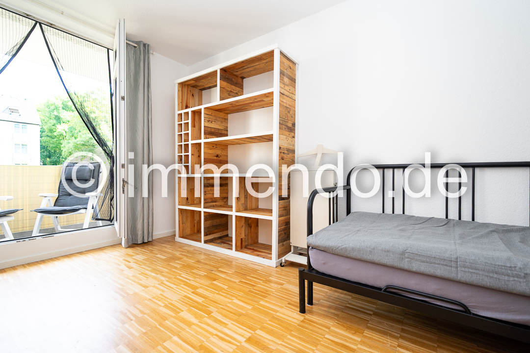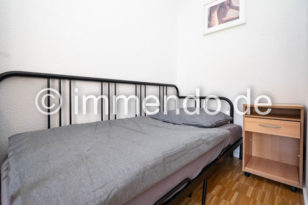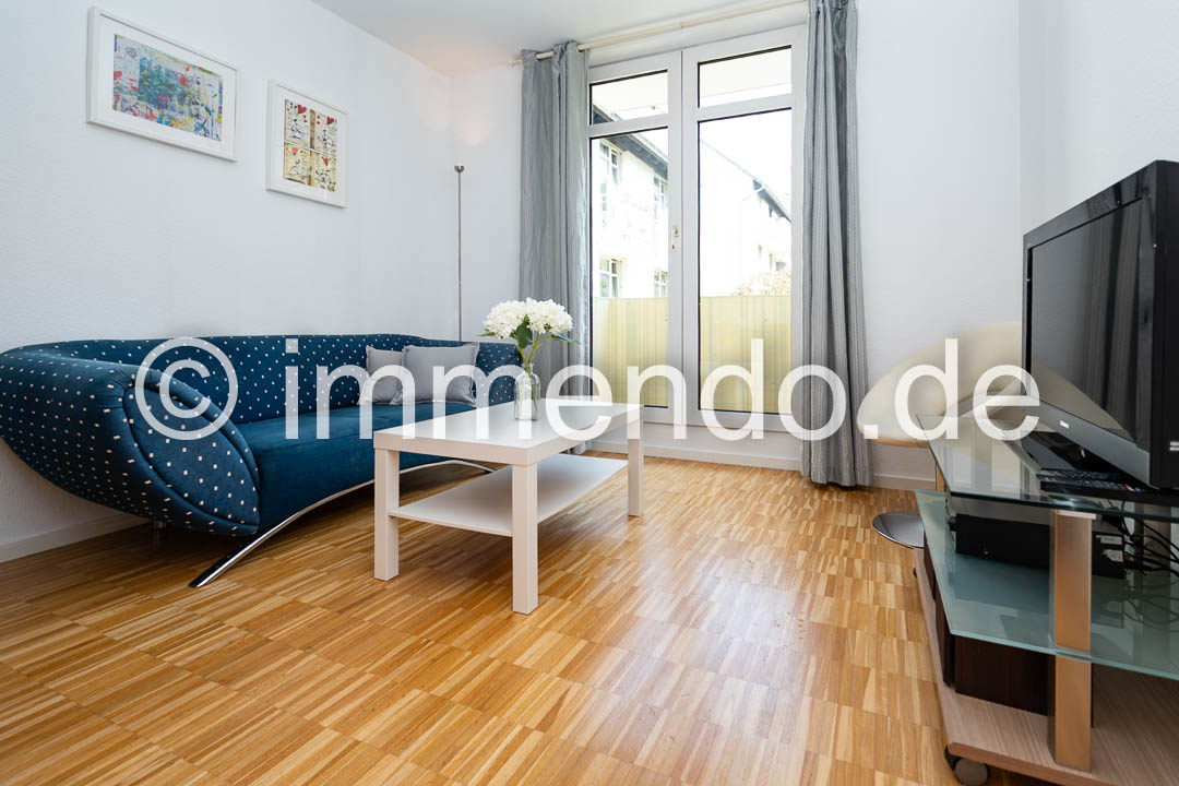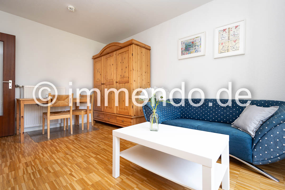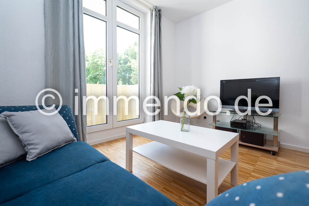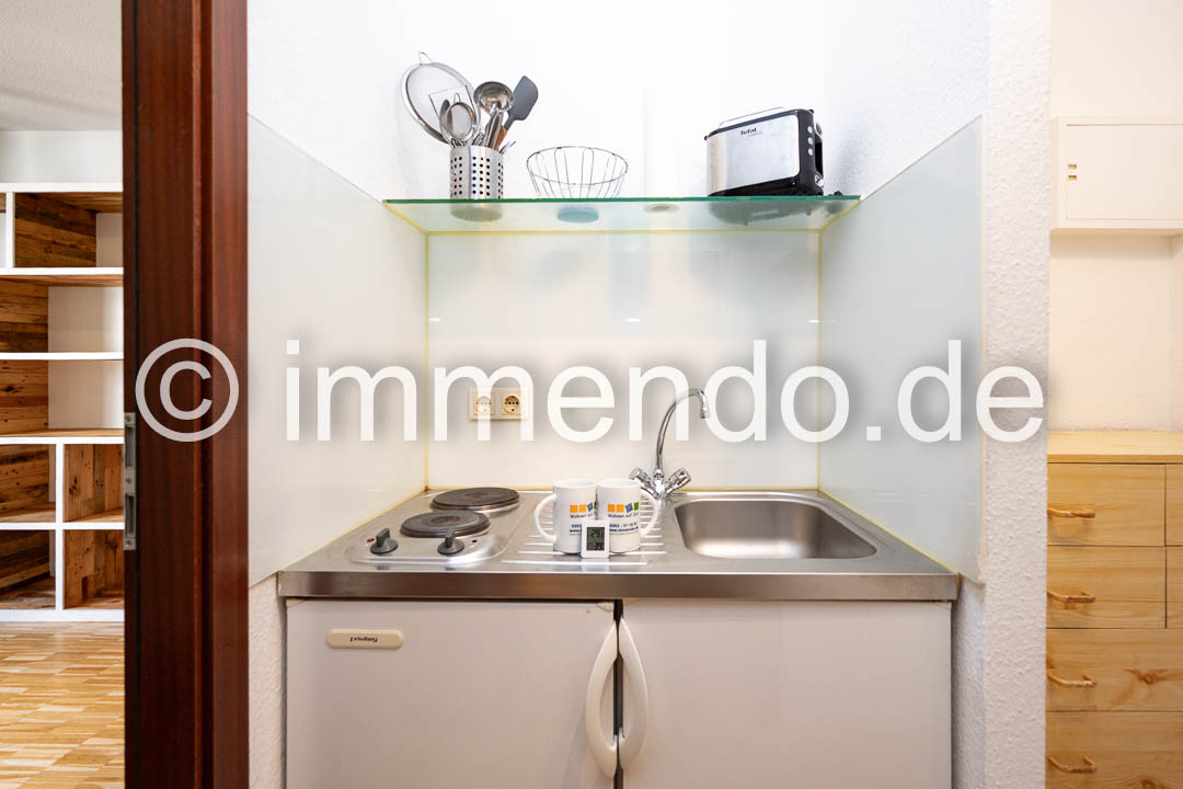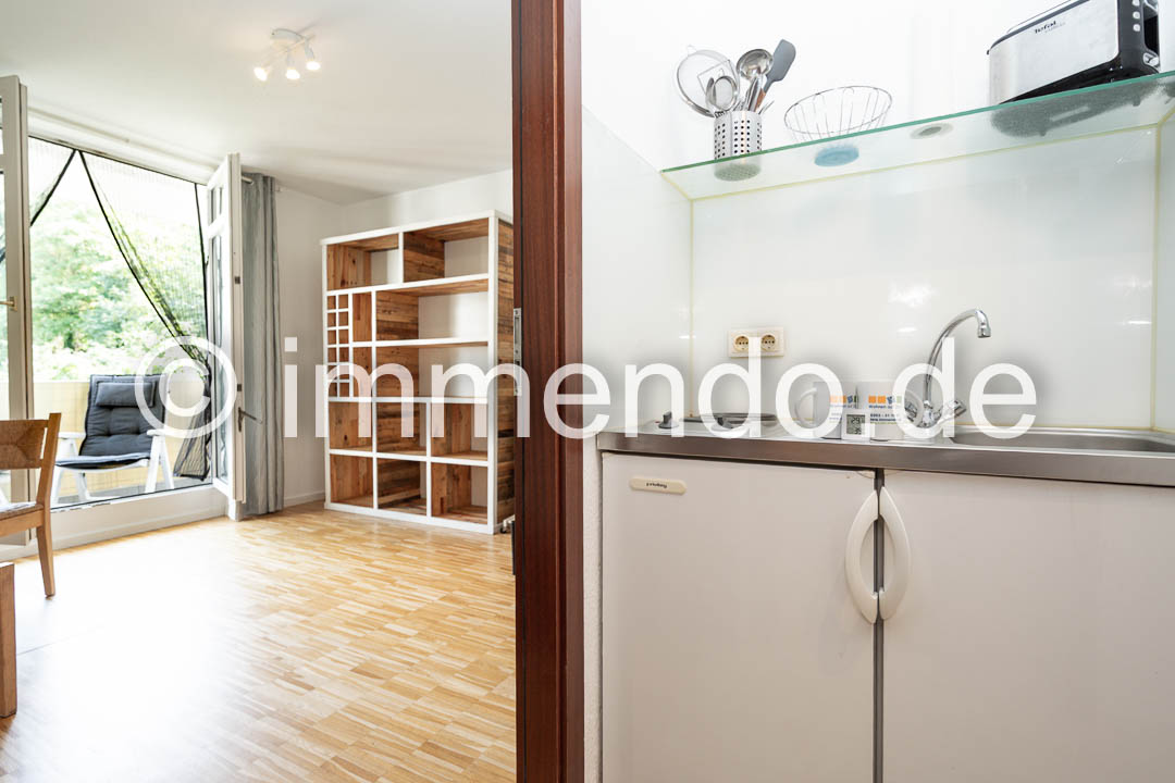 Speldorf, kleines, modern möbliertes Apartment in zentraler ruhiger Lage mit Balkon zum den Innenhof. Der Wohn-Schlafraum mit Zugang zum Balkon verfügt über ein Einzelbett, eine große Regalwand sowie einem Arbeitsplatz. Das separate Wohnzimmer, ebenfalls mit bodentiefen Fenstern und kleinem Austritt, bietet ein bequemes Sofa mit Flachbildfernseher 32 Zoll, einen Essplatz und einen geräumigen Kleiderschrank. Gelegenheit zu Kochen bietet eine gut ausgestattete Küchenzeile im Flur. Das hell geflieste Bad hat eine Glasdusche.