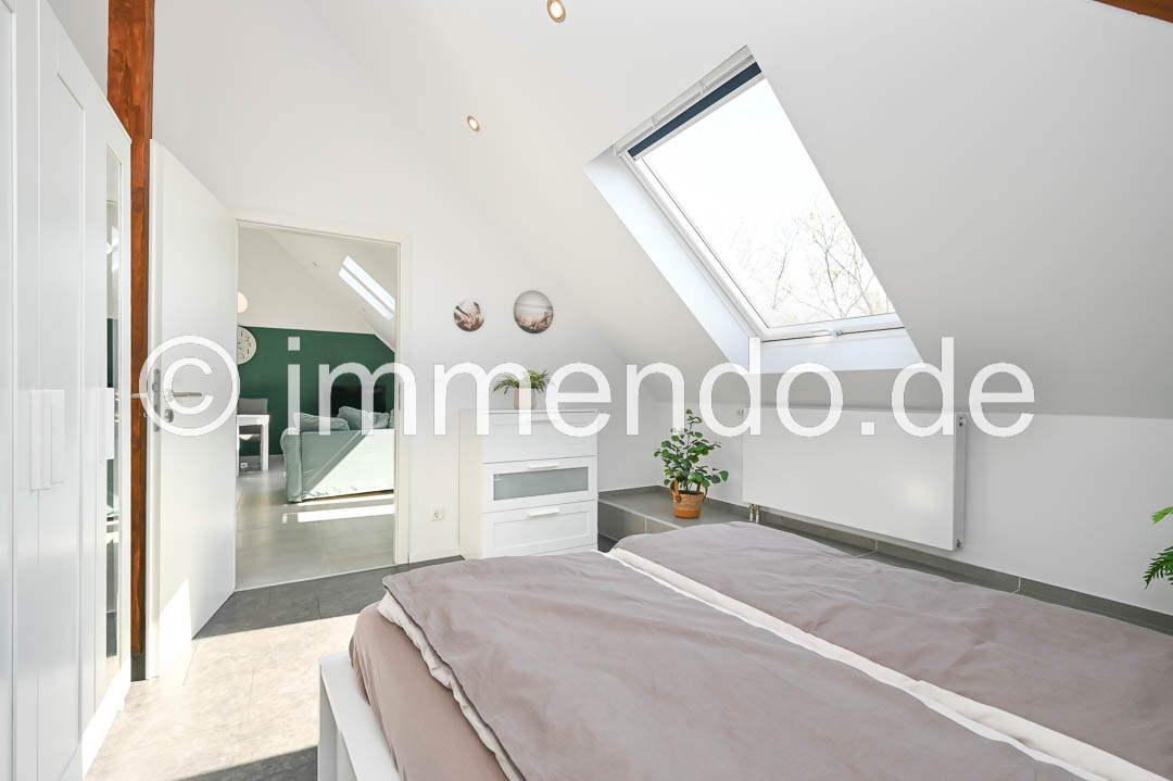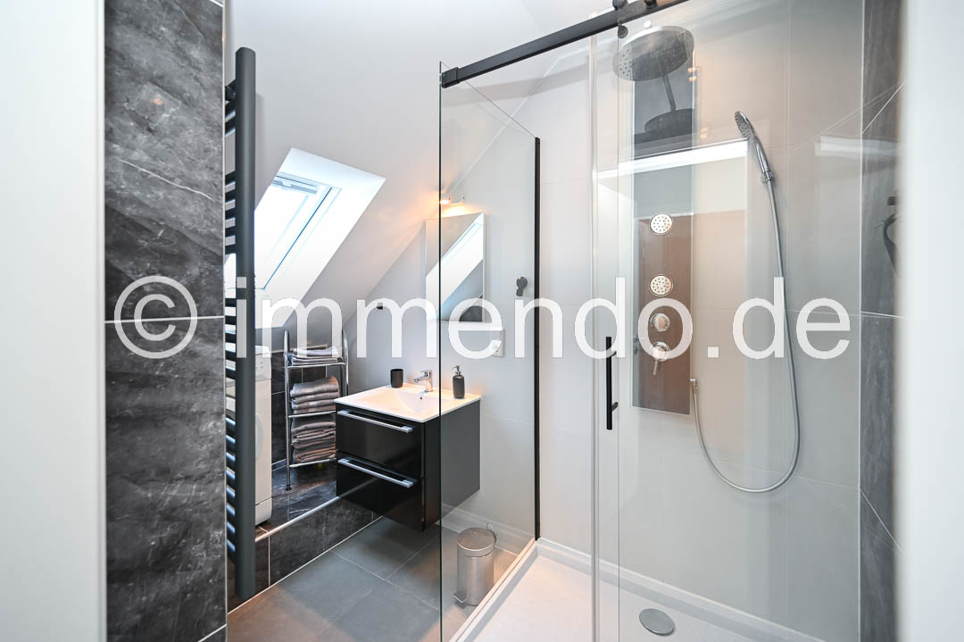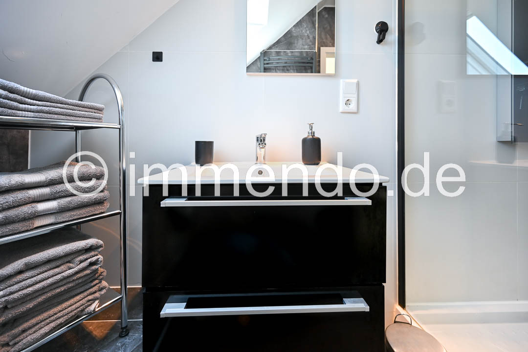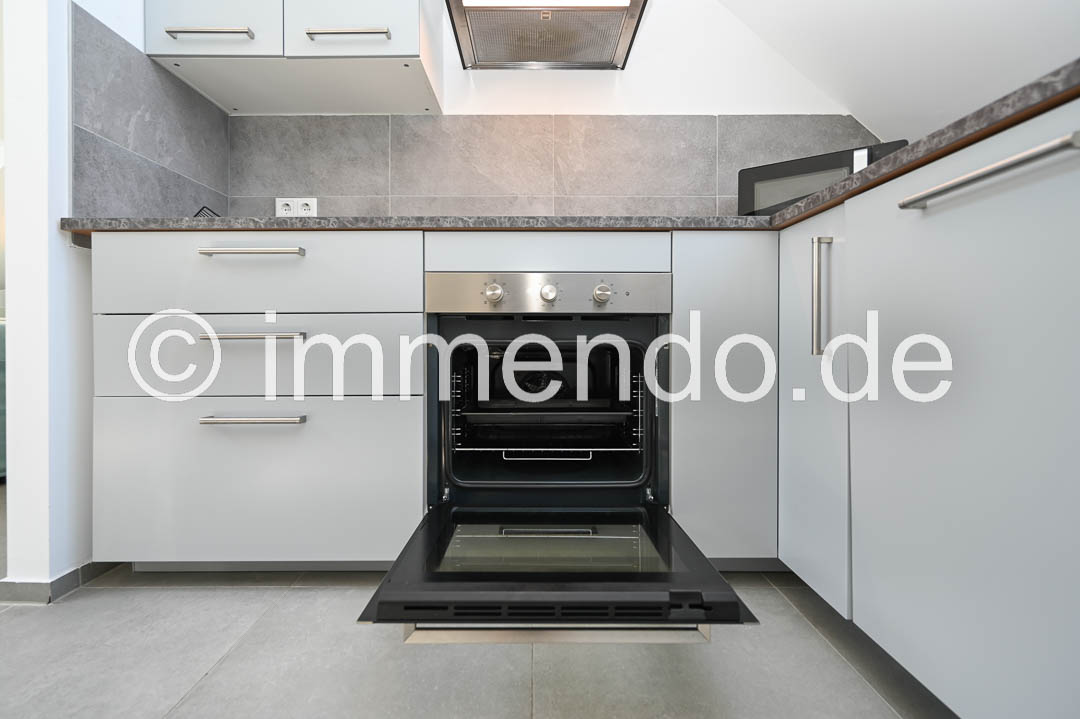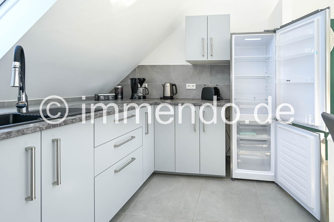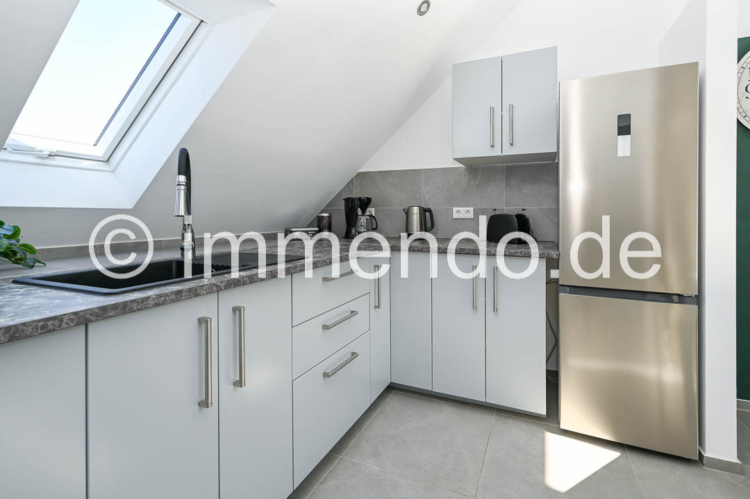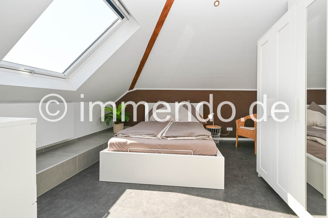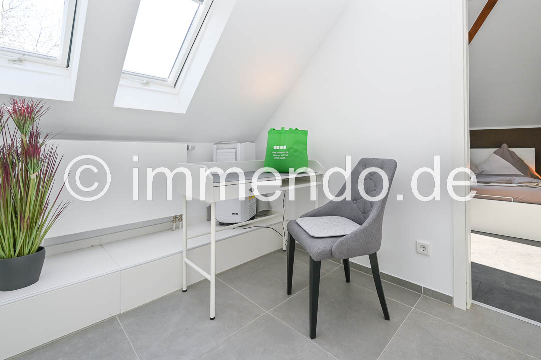 Styrum, sehr schöne, lichtdurchflutete Dachgeschosswohnung. Die Höhe des ausgebauten Spitzboden und die moderne Einrichtung und Aufteilung der Wohnbereiche sind sehr beeindruckend. Der Wohnraum bietet ein bequemes Schlafsofa, ein Smart TV, einen schicken Essbereich sowie einen Schreibtisch. In der großzügigen Einbauküche ist mit einem Induktionsfeld mit Backofen, einer Spülmaschine und einer großen Kühl-Gefrierkombination komplett eingerichtet. Das separate Schlafzimmer ist mit einem Bett 160cm, einer Kommode und einem Kleiderschrank ausgestattet. Das moderne Bad mit komfortabler Regendusche, eigener Waschmaschine und ein separates WC runden dieses Angebot ab und auch ein Klimagerät gehört dazu.