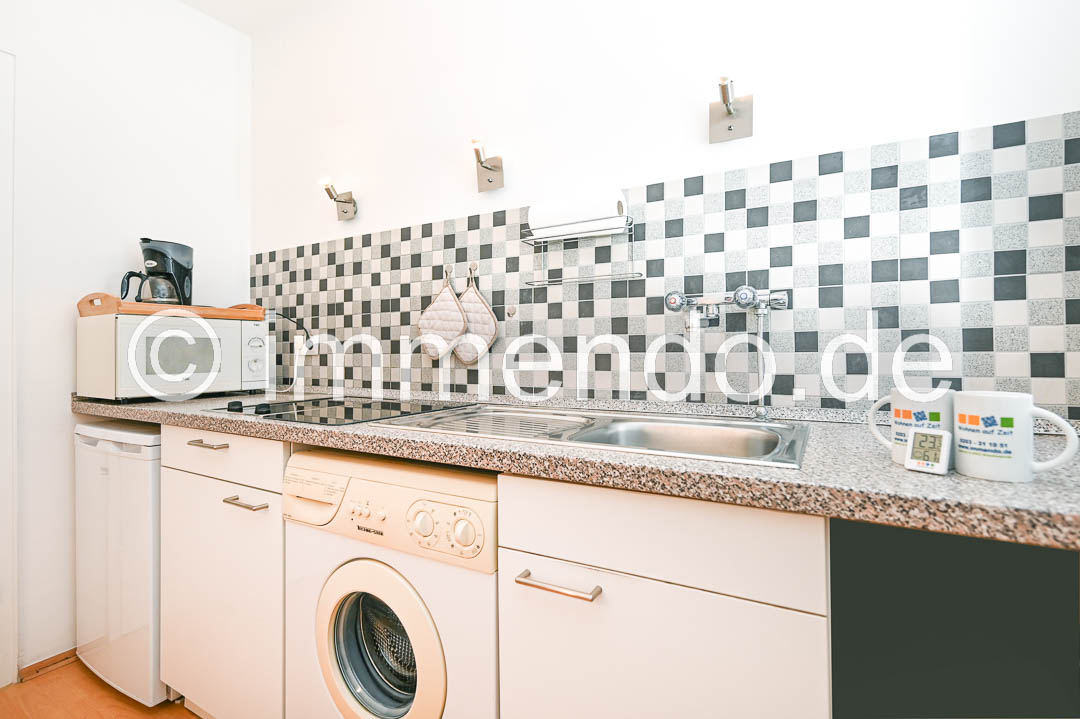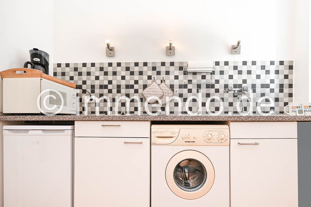 Laminat, Mikrowelle, TV, Waschmaschine, Fliesen, franz. Bett, Einbauküche, Bettwäsche, Handtücher, franz. Bett 140cm, Wannenbad, Wohnküche, komfortabel